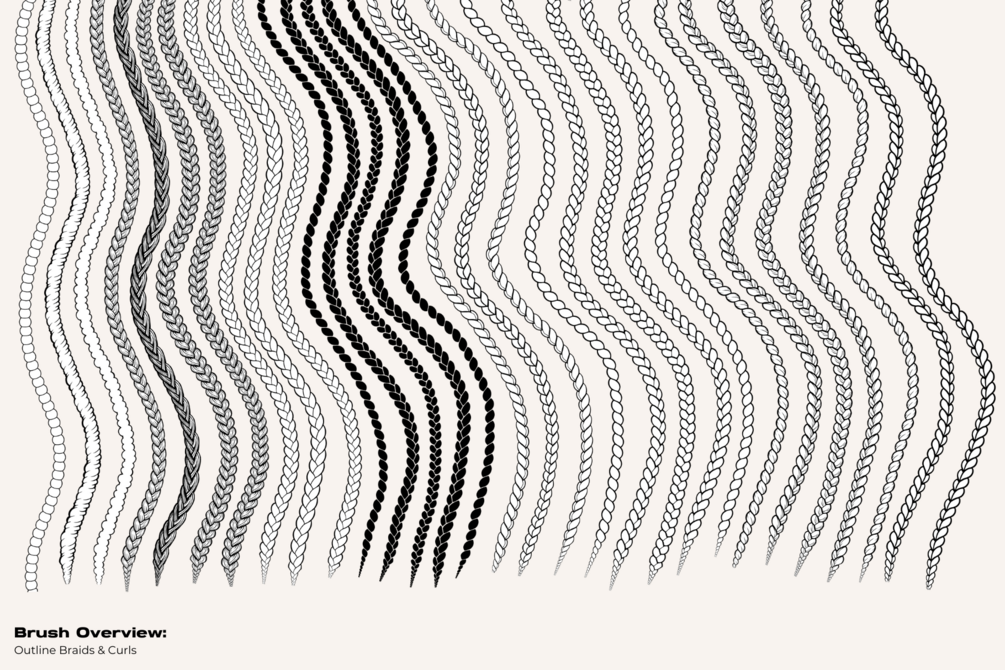 This is volume 2 of our outline braid and curl brushes. This set includes side and partial braid brushes as well as expanded curl outlines and beads! These are perfect for comics, cartoons or anime style illustrations.