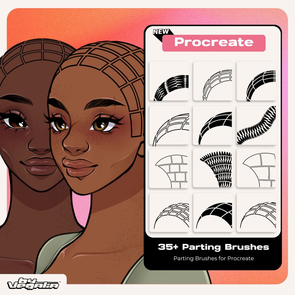 35 parting brushes for braids. 15 different parting designs both filled and outlined in 4 different perspectives.