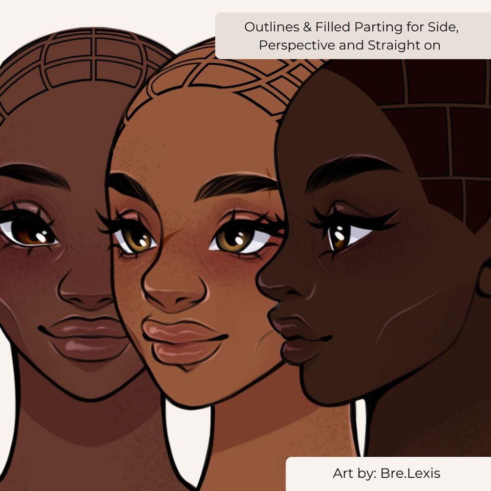 35 parting brushes for braids. 15 different parting designs both filled and outlined in 4 different perspectives.