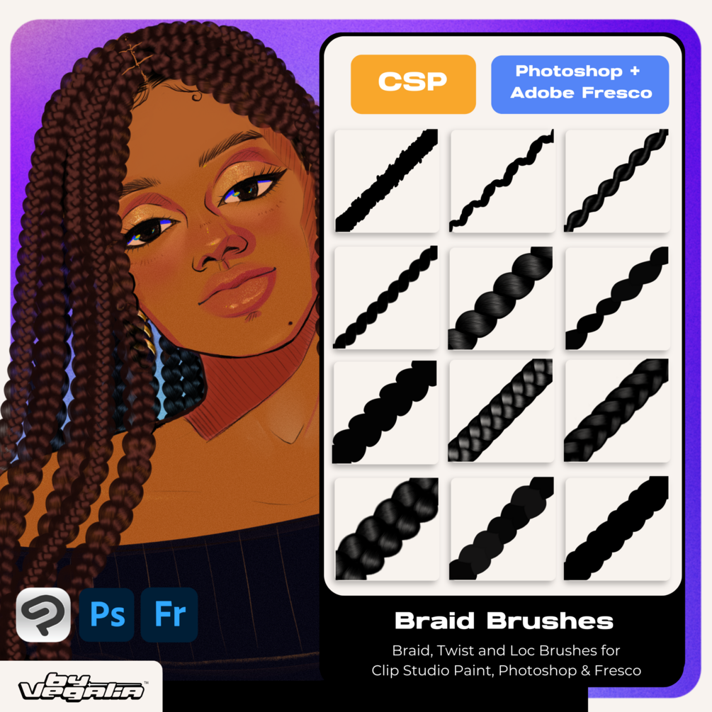 Braid, twist and locs brushes for .abr .Compatible with Photoshop, Photoshop Elements, Adobe Fresco and Clip Studio Paint. This also includes .sut files!