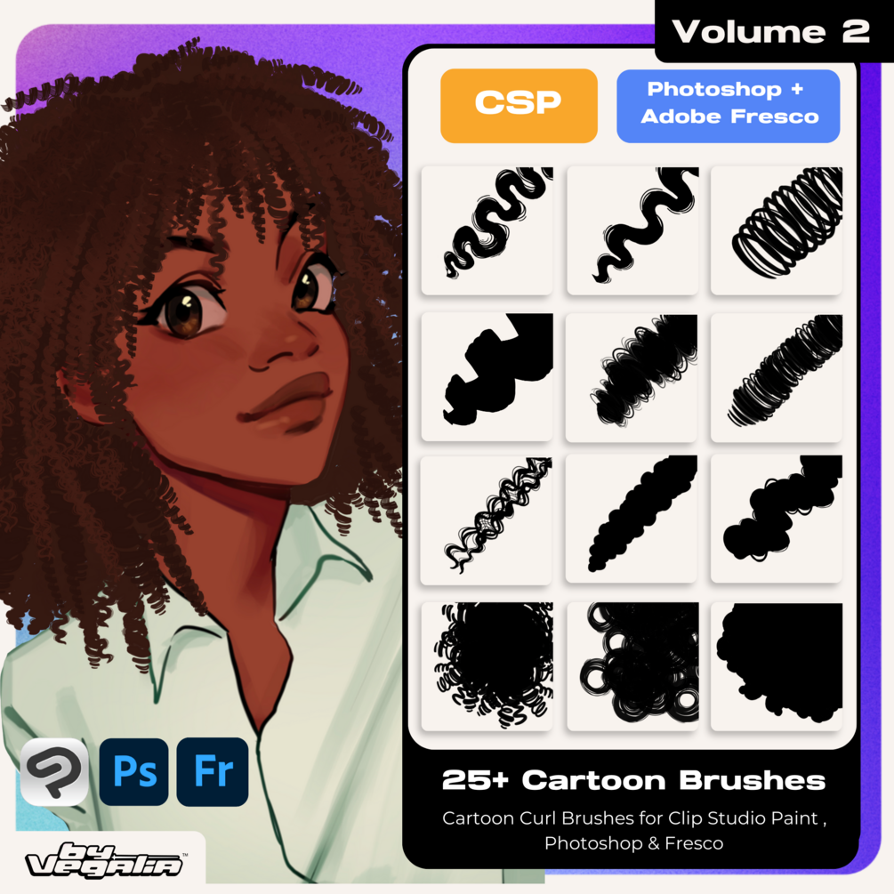 Vol 2 Clip Studio Paint, Photoshop & Fresco Cartoony Curl Brushes by Vegalia
